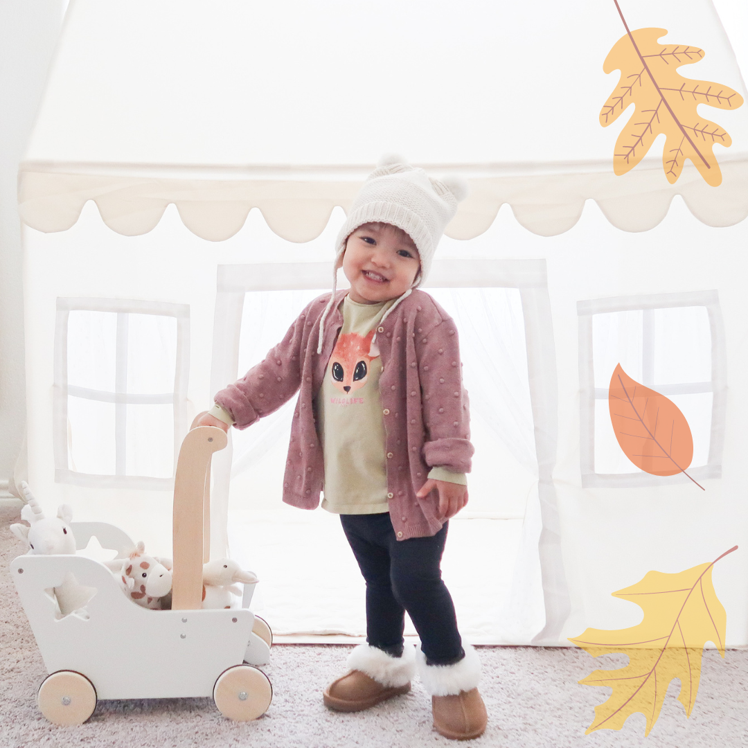 My daughter looks adorable in a popcorn cardigan layered over a long-sleeved shirt featuring a cute deer graphic, both found at Once Upon A Child. She’s keeping it comfy with leggings and sporting a new pair of boots. You might recognize her beanie from one of last year’s blog posts — it’s great to see how timeless pieces can be mixed and matched!