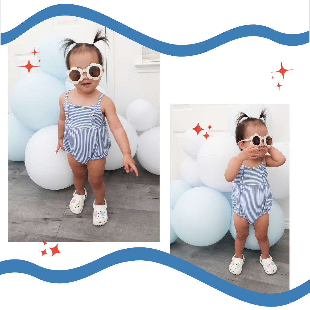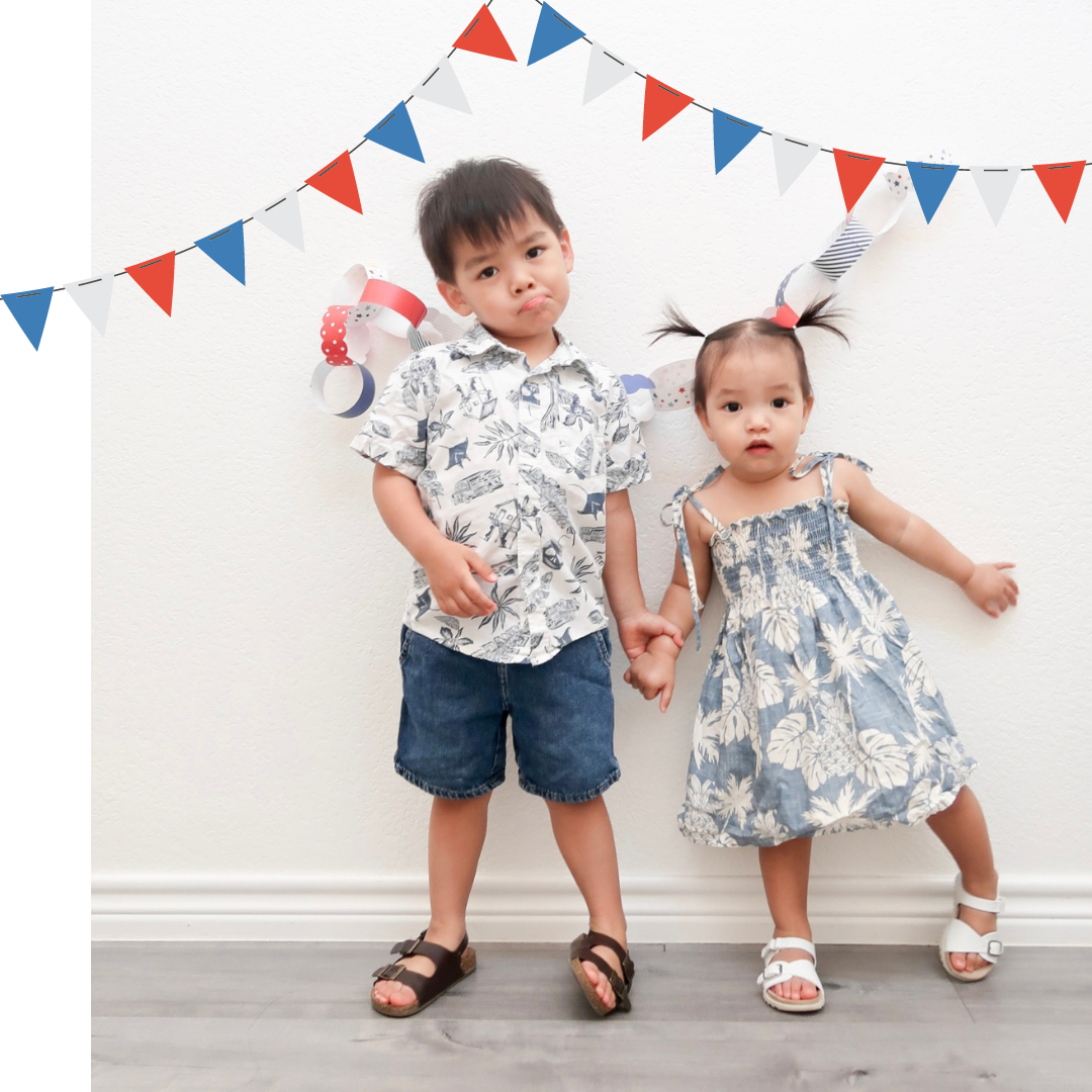 Last year for Independence Day, I styled a red strawberry/seersucker theme and the year before that, we all wore navy gingham. I’m excited for this year’s tropical attire! It’s been fun to try different themes, especially since the kids grow up so fast that clothes from previous years won’t fit anymore. In case we decide to hang out by the pool, I've had this striped blue swimsuit stashed away for ages, and now my little girl fits into it perfectly. It pays to shop ahead. These white flower sunglasses really tie the look together. Accessories may not always stay on my kids, but they make for some adorable pictures!